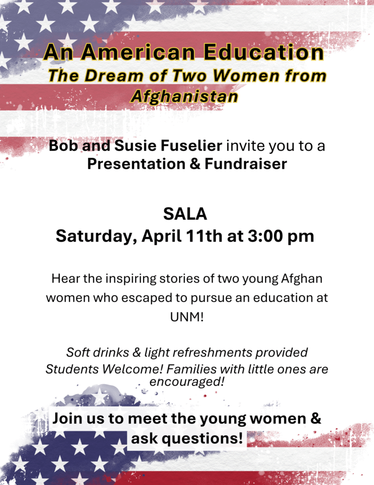 Join Bob and Susie Fuselier for a meaningful presentation and fundraiser featuring two young Afghan women who courageously left their home country in pursuit of higher education. Now continuing their journey through the University of New Mexico, they will share their powerful stories of resilience, hope, and determination.