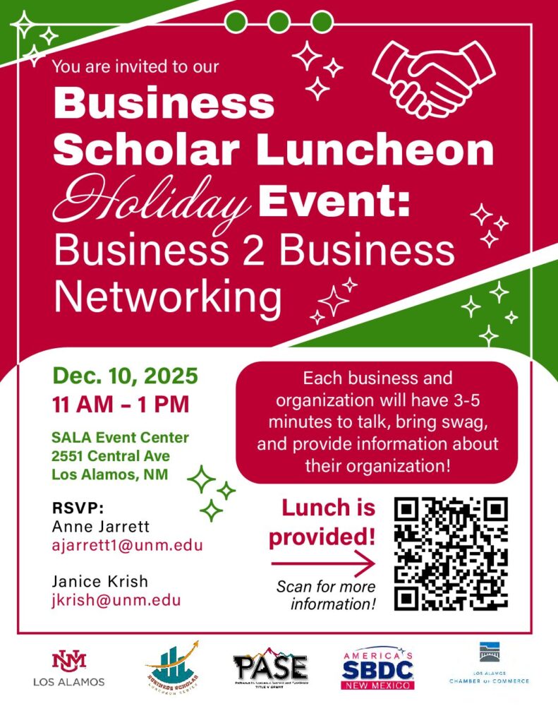 Join us on December 10, 2025 at 11AM – 1PM in SALA Event Center for a Business Scholar Luncheon Holiday Event: Business-2-business networking.