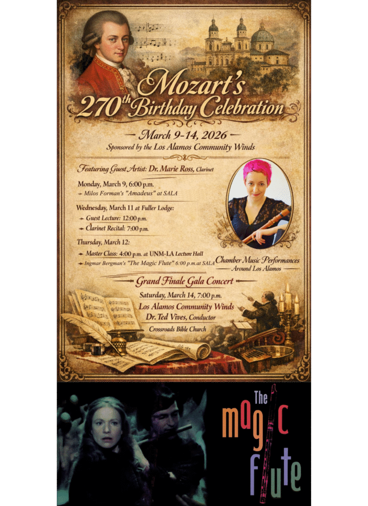The Los Alamos Community Winds are proud to sponsor “Mozart Week in Los Alamos” March 9-14, 2026. The week will consist of events celebrating the 270th Birthday of composer Wolfgang Amadeus Mozart and include presentations and a recital by Dr. Marie Ross, professor of clarinet at the University of Auckland, screenings of Milos Forman’s Amadeus and Ingmar Bergman’s The Magic Flute at SALA, and a finale Gala Concert of the works of Mozart performed by the award-winning Los Alamos Community Winds under the direction or Dr. Ted Vives.
