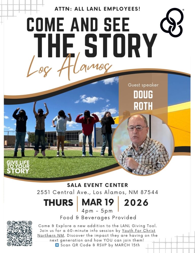 Come & Explore a new addition to the LANL Giving Tool. Join us for a 60-minute info session by Youth For Christ Northern NM. Discover the impact they are having on the next generation and how YOU can join them!